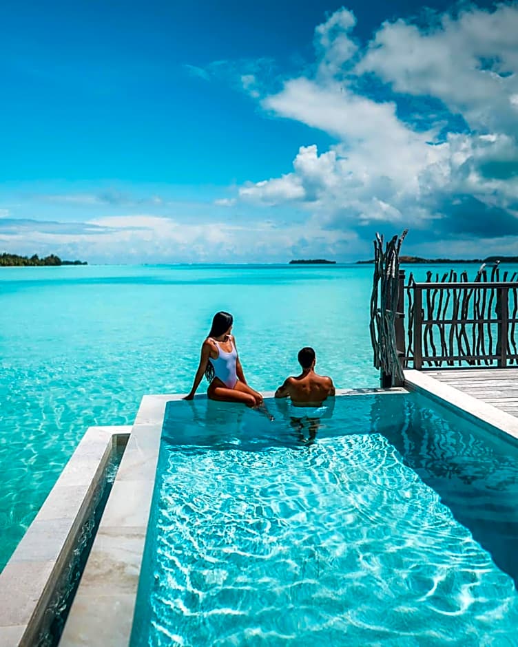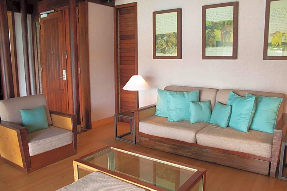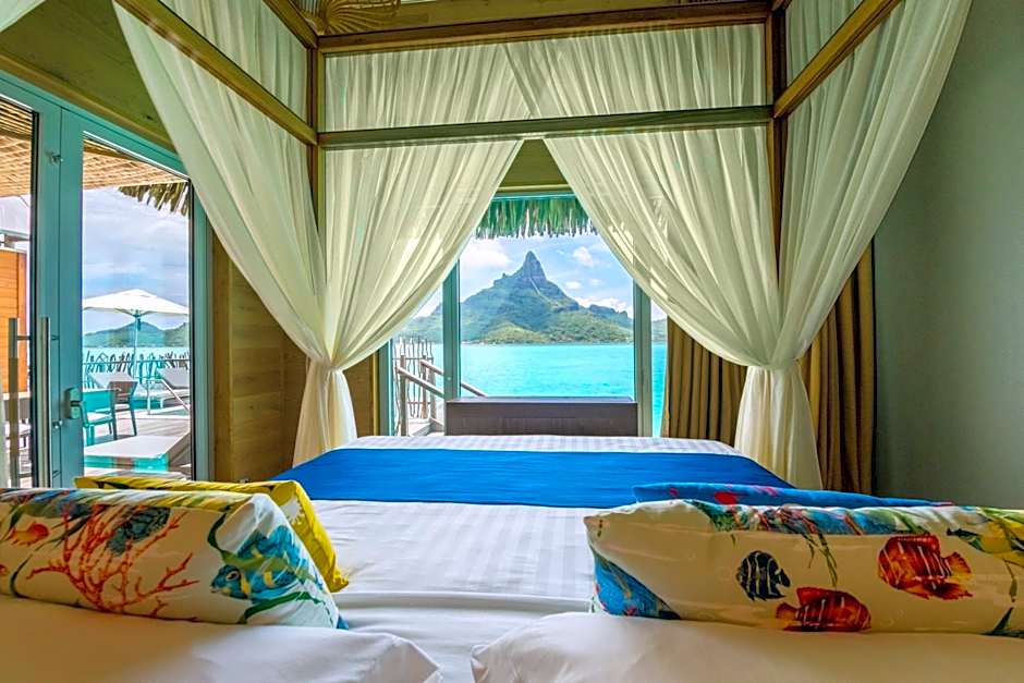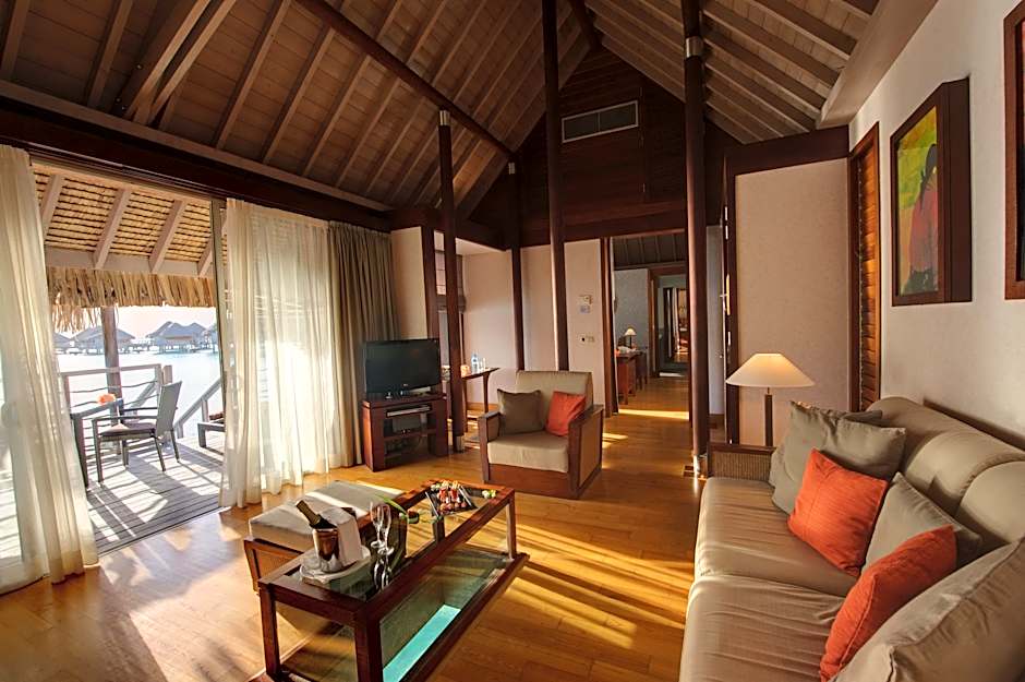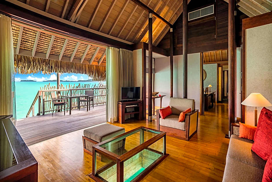 Features a fresh water shower, 2 flat-screen TVs, glass-bottom coffee table, and a terrace with sun loungers and direct lagoon access.